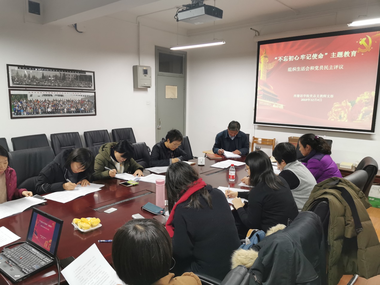 2019年12月4日下午四点,西葡语学院党总支教师党支部在主楼219会议室集体学习十九届四中全会精神并召开专题组织生活会。会议由教师支部书记张方方主持,支部全体教师党员出席会议。