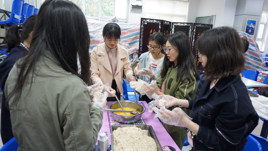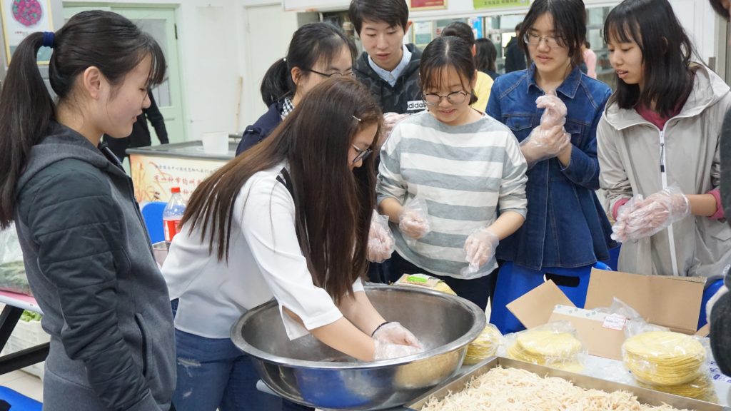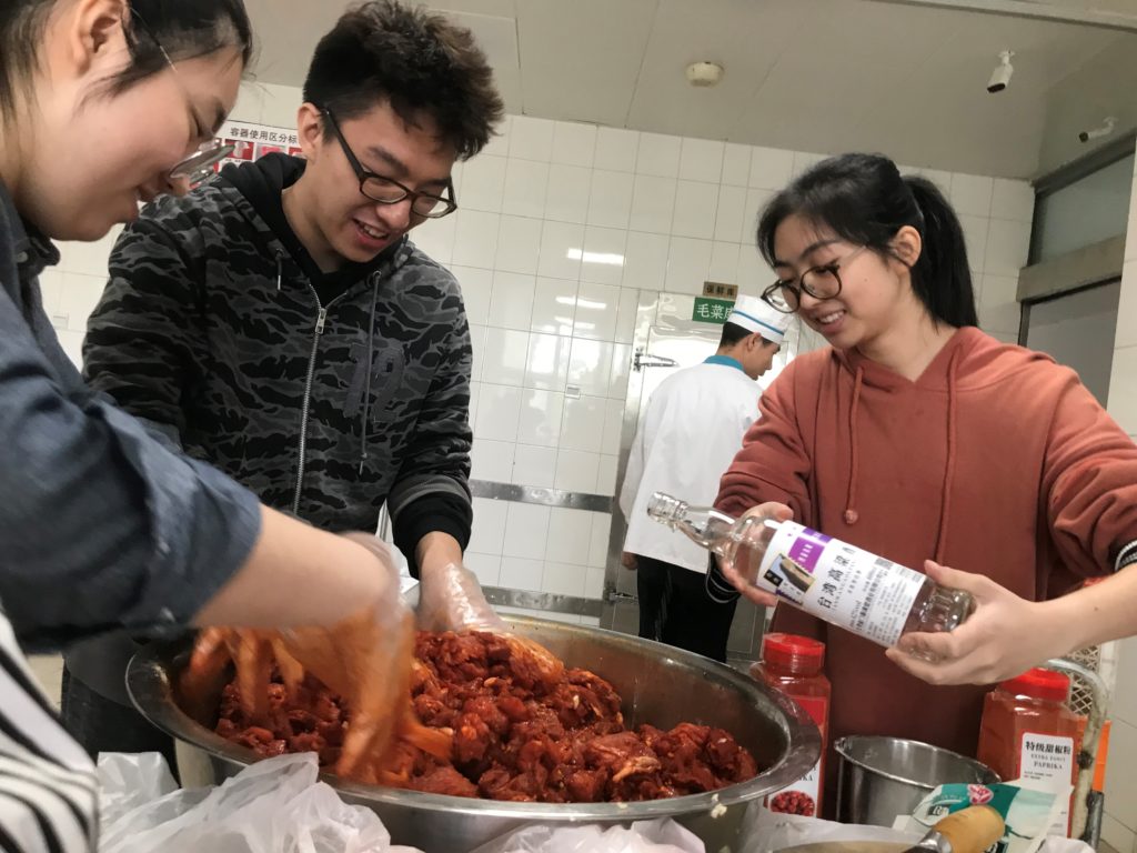 下午1:40,志愿者们陆陆续续到达食堂二层,美食之夜的食品制作正式开始。所有志愿者在各自小组长的指挥和指导下,在食堂师傅们的帮助下,开始了有条不紊的工作。
