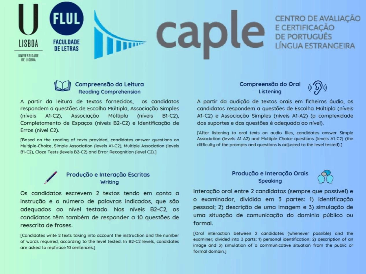PP电子游戏网站CAPLE考点将于2025年5月6至8日举行CAPLE葡萄牙语水平测试。各级别开放名额分别为:CIPLE 16人、DIPLE 33人、DAPLE 26人、DUPLE 15人,报名截止日期为2025年4月14日。各级别具体考试日期请参见CAPLE考试中心官网(http://caple.letras.ulisboa.pt/)。